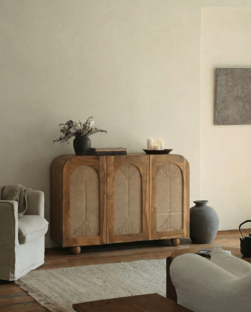 A softly sculpted wooden console with arched details, designed to add calm boho character to your space.