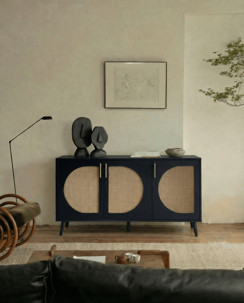 A modern teak and rattan console that balances bold contrast with light, airy natural materials.