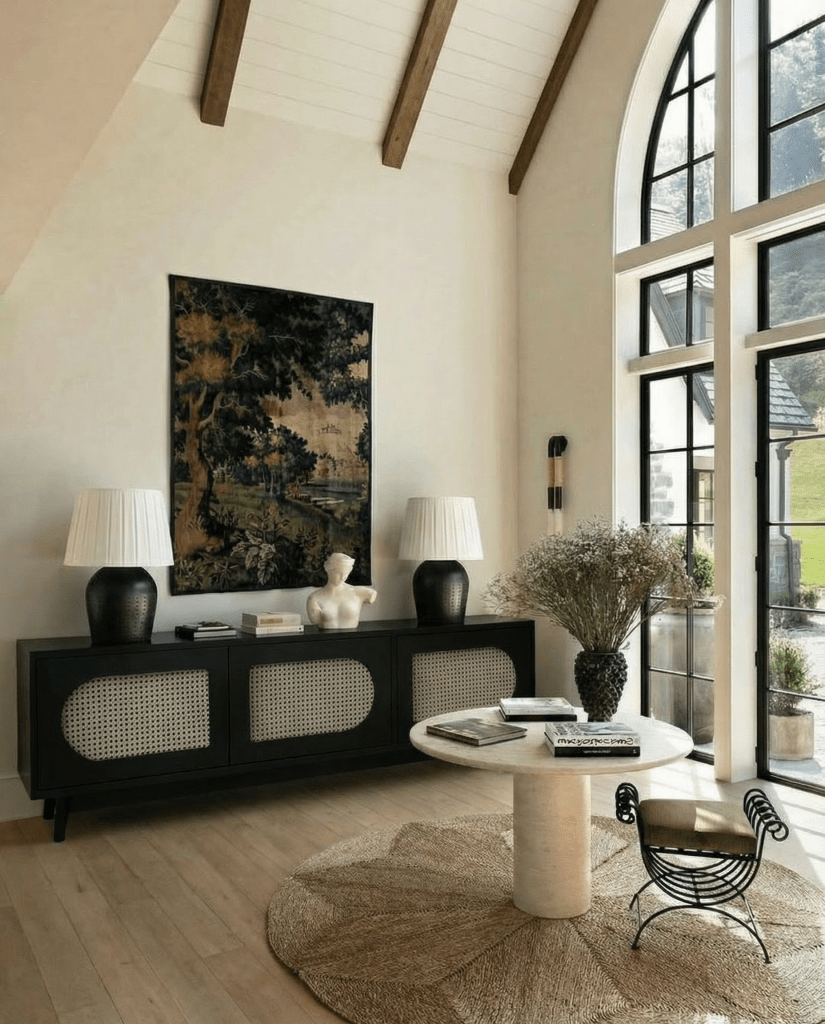 A sleek black console with rattan fronts, blending contemporary lines with handcrafted warmth.