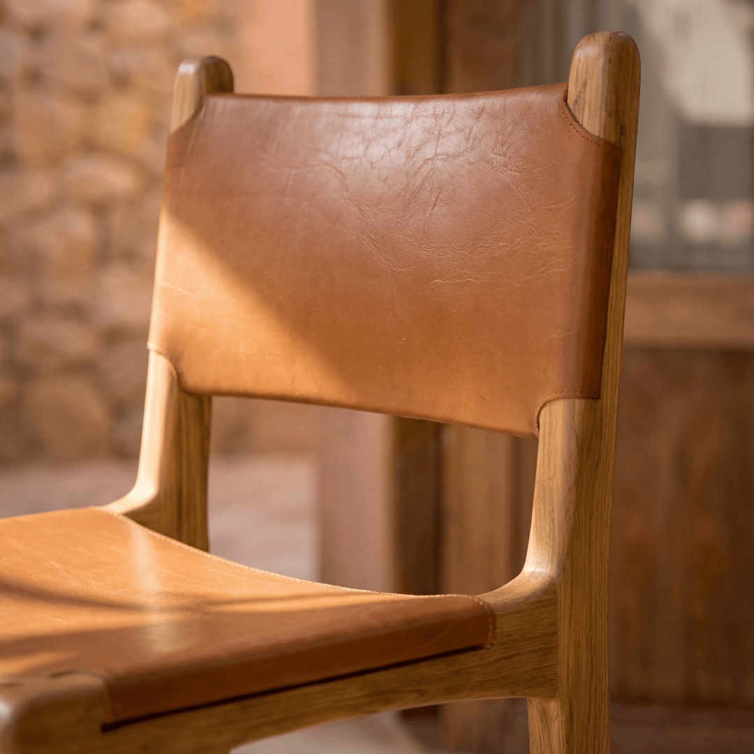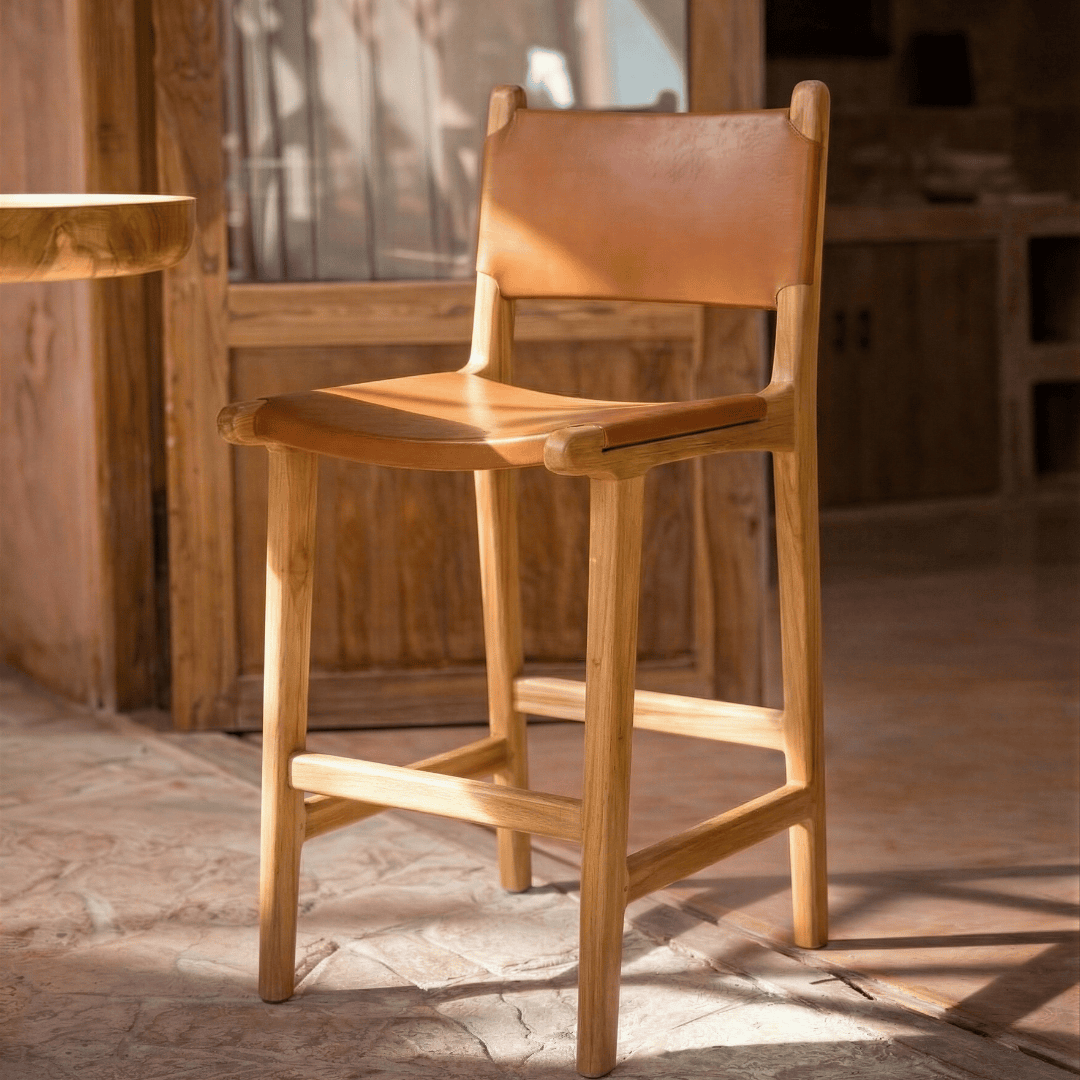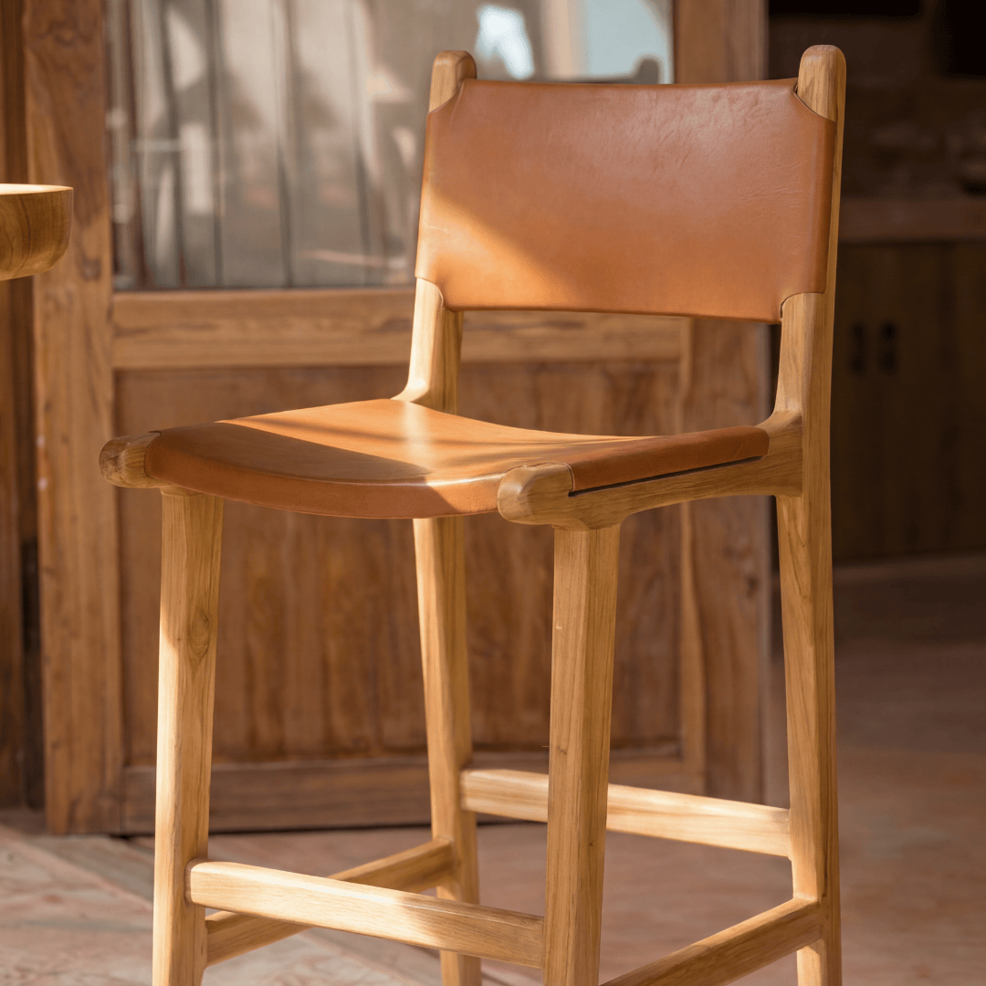 Bar stool is made of teak wood and leather.