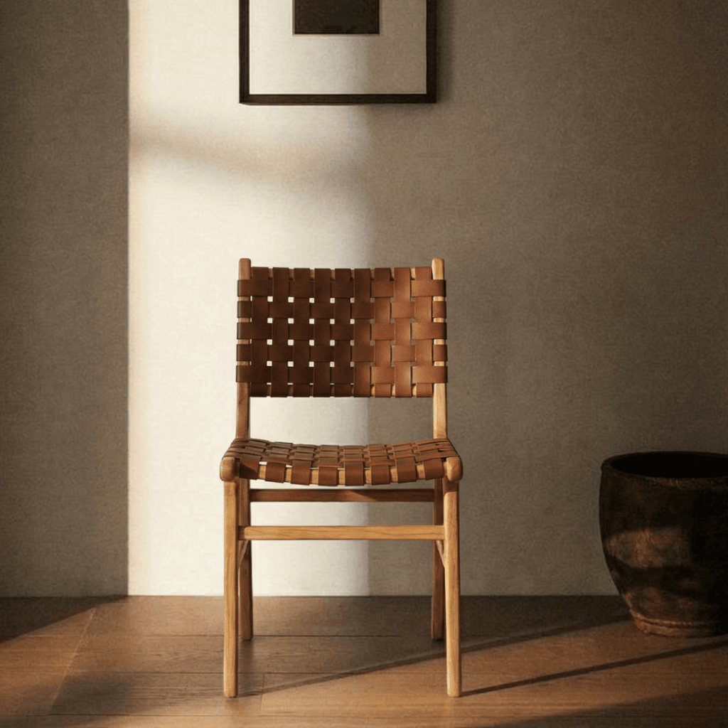 This lightweight teak and leather chair is perfect for both the dining room and the bedroom. It is also great for use in restaurants and cafes.