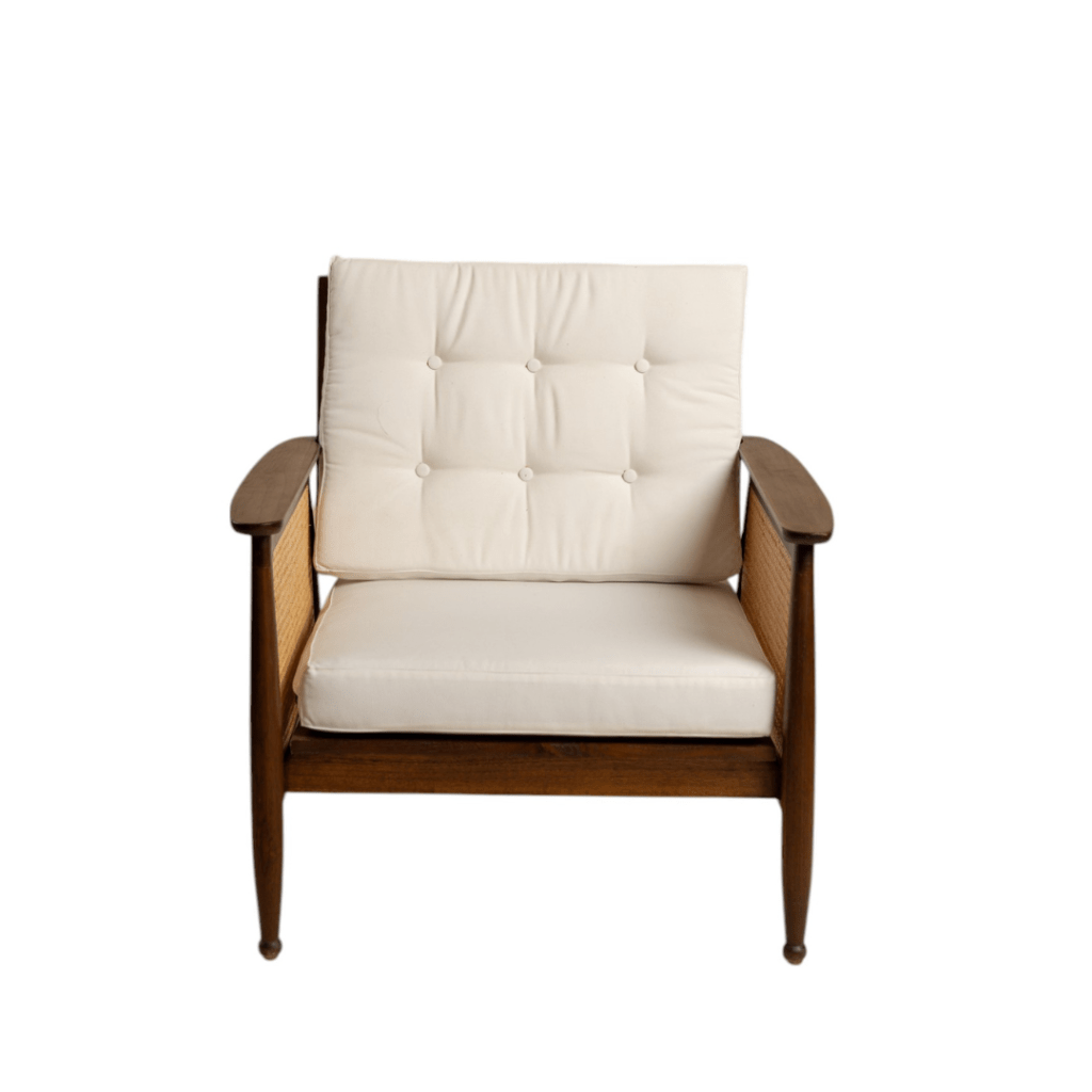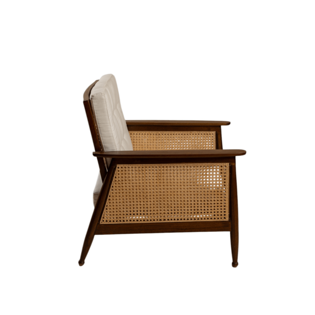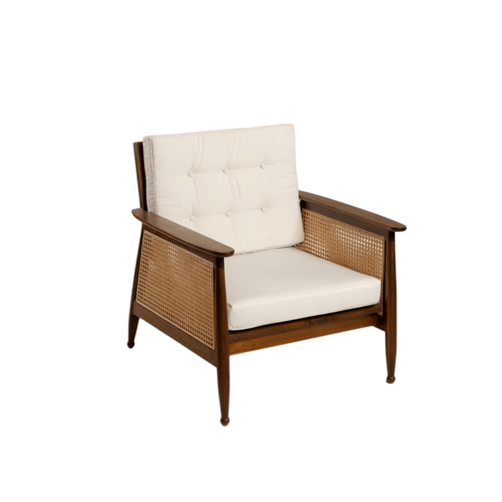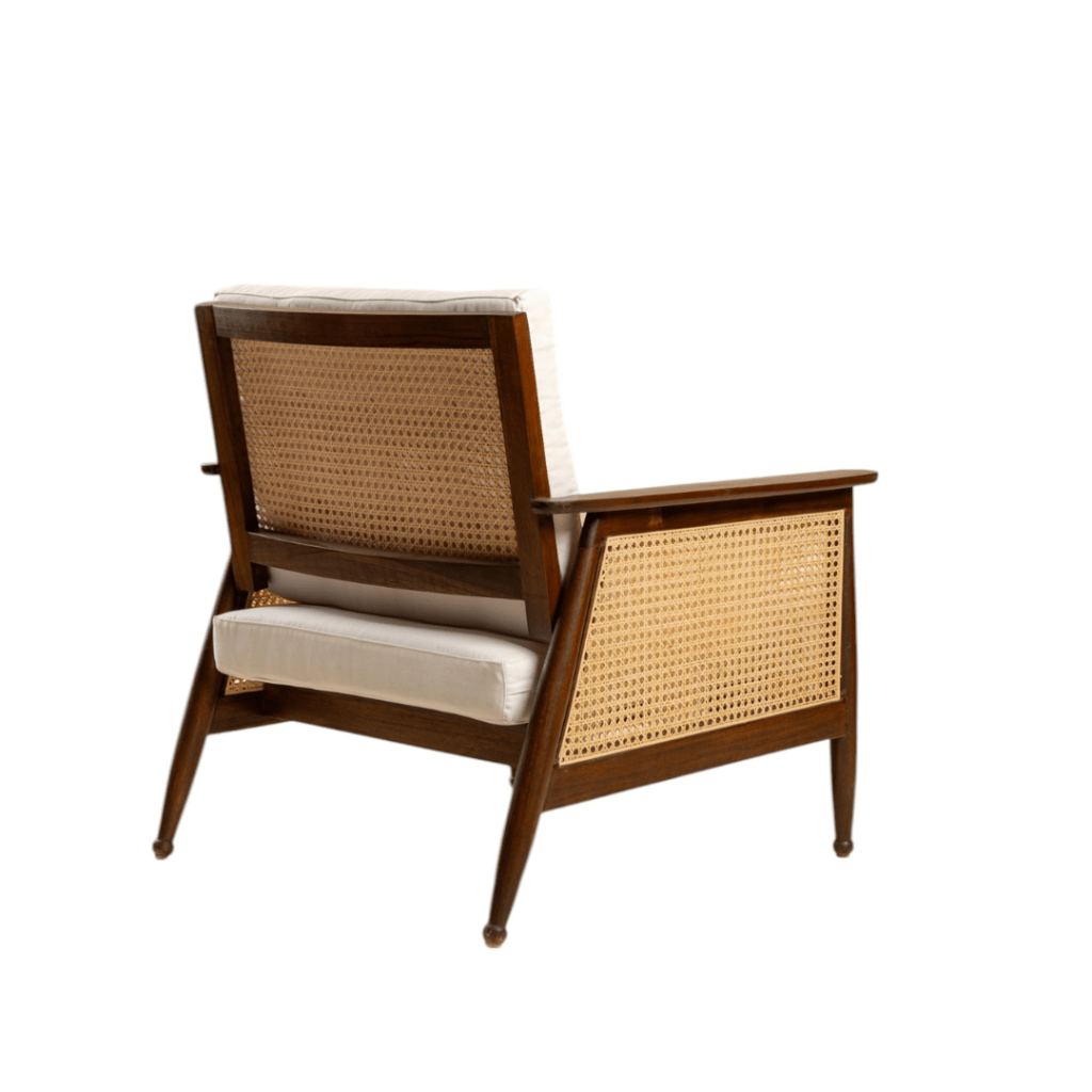 Representing you a very elegant and sophisticated armchair – Marcelo. It stands out for its contrasting materials. It has a solid wooden frame and a woven rattan back, which is covered with a high-quality white fabric cushion.